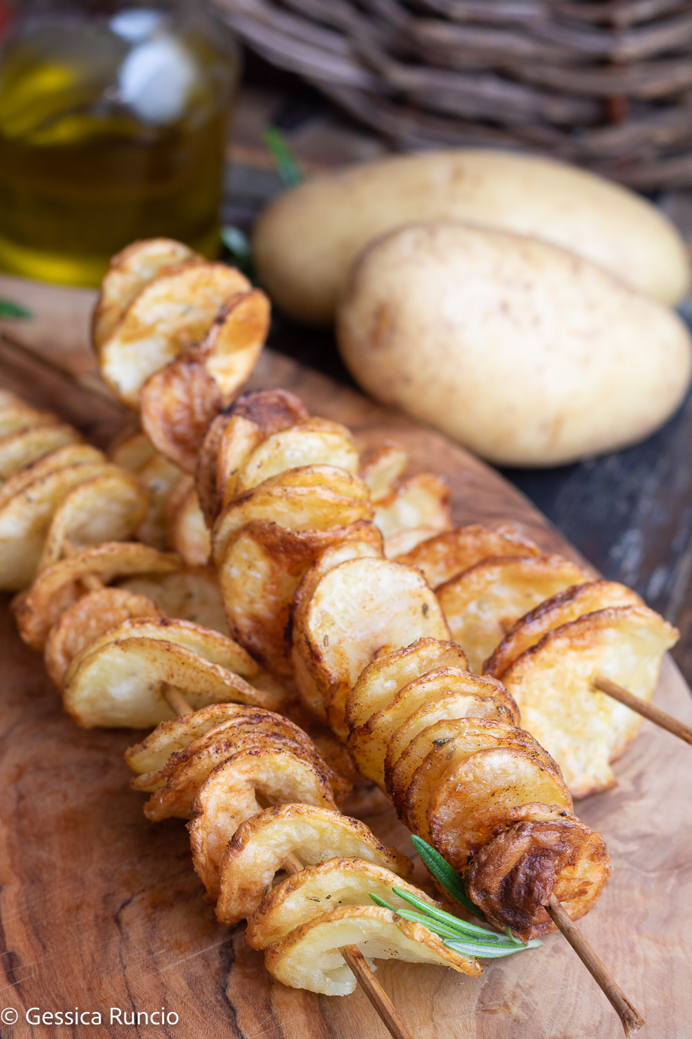 Infilzate ogni patata con uno stecco lungo di legno, cercando di arrivare all’estremità opposta.