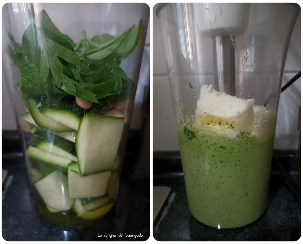 In un frullatore mettere una zucchina tagliando tutta la parte esterna gettando la parte interna più morbida e con i semi, aggiungere l’olio e.v.o., i pinoli e frullare il tutto.