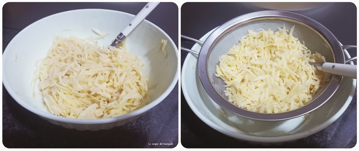 Grattugiare le patate con una grattugia a fori larghi, poi si può procedere in due modi, o strizzarle bene con un canovaccio, oppure aggiungere un pizzico di sale, mescolare e metterle a scolare con un passino.