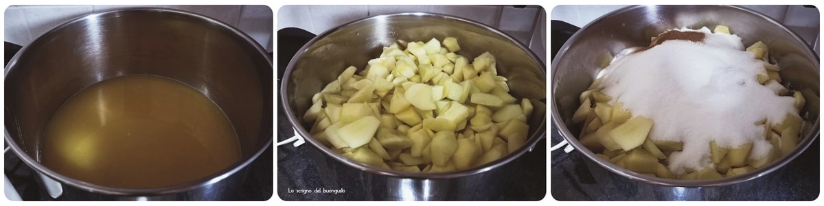 Poi togliere la buccia e il torsolo alle mele, tagliarle a pezzi e aggiungere anche queste.
