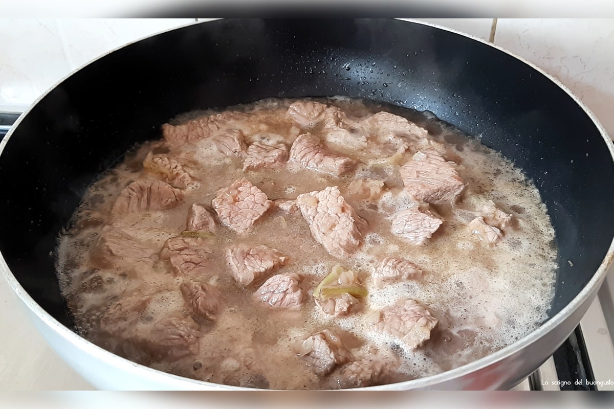 Aggiungere lo spezzatino e lasciare cuocere per circa 10 minuti fino a quando la carne non avrà più il colore rosso del crudo della carne.