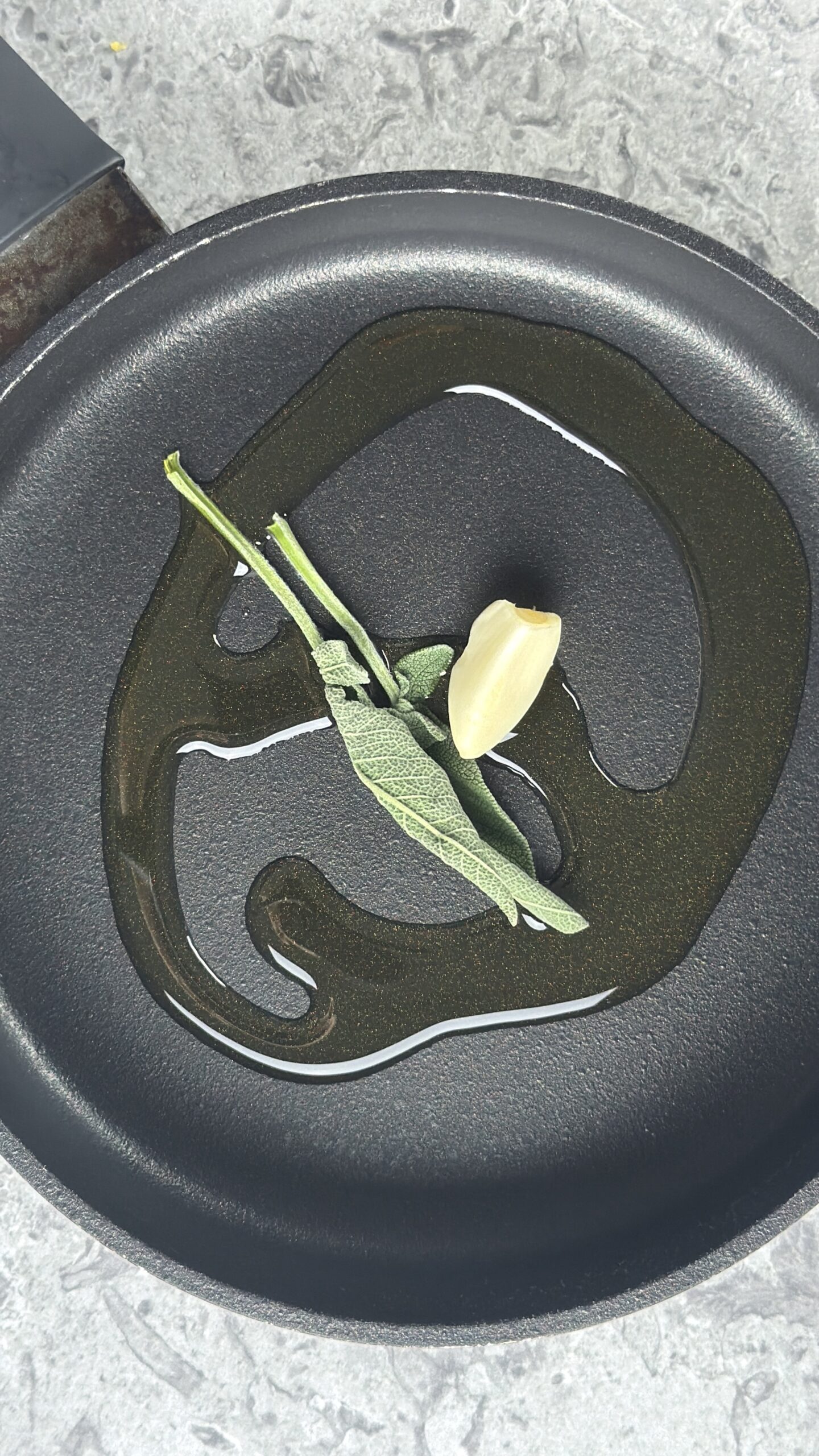 Inizia la preparazione della pasta gratinata funghi e gorgonzola scaldando in padella due cucchiai di olio extravergine di oliva con uno spicchio di aglio e qualche foglia di salvia.