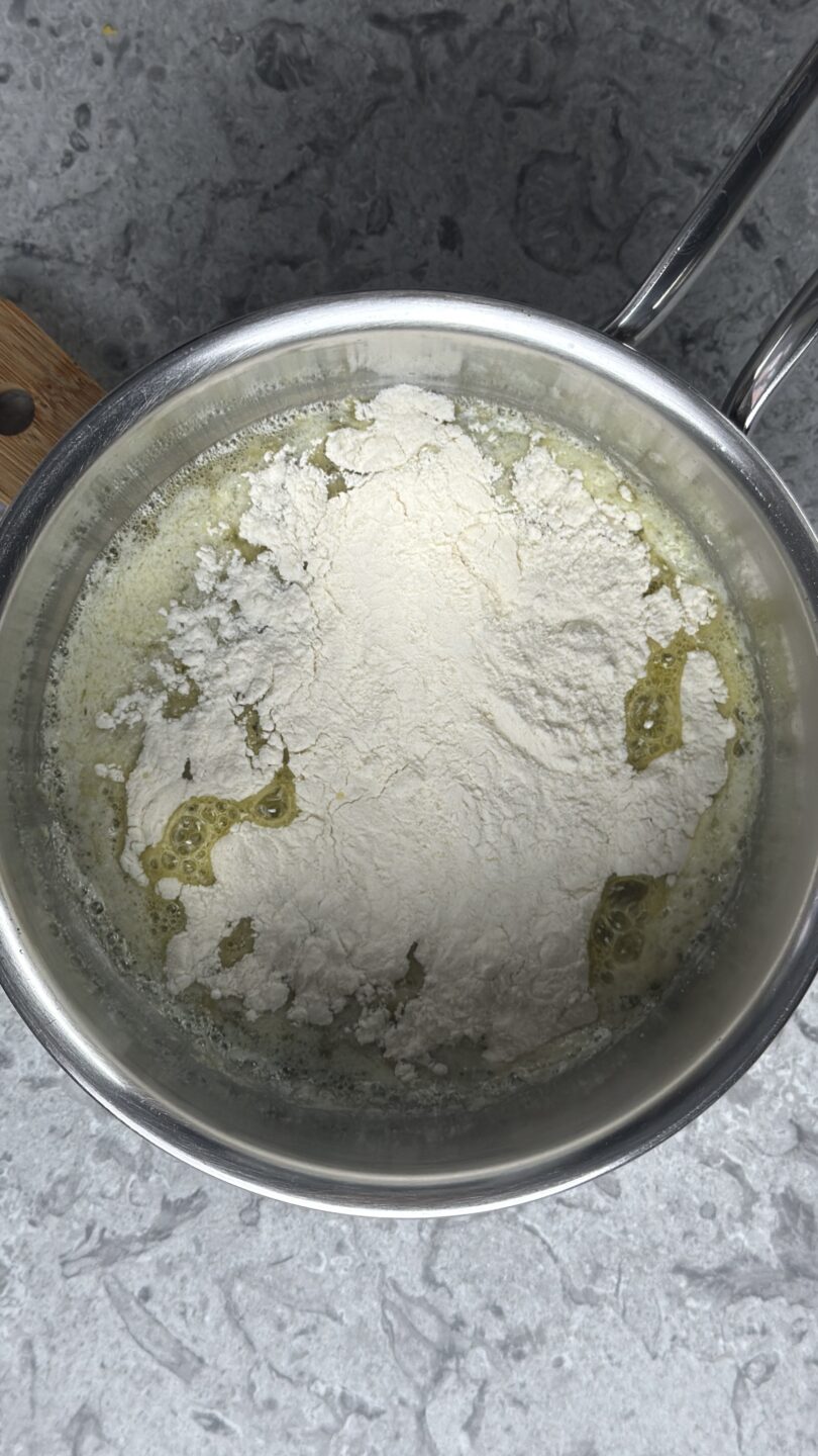 Fai fondere il burro poi aggiungi la farina a pioggia.