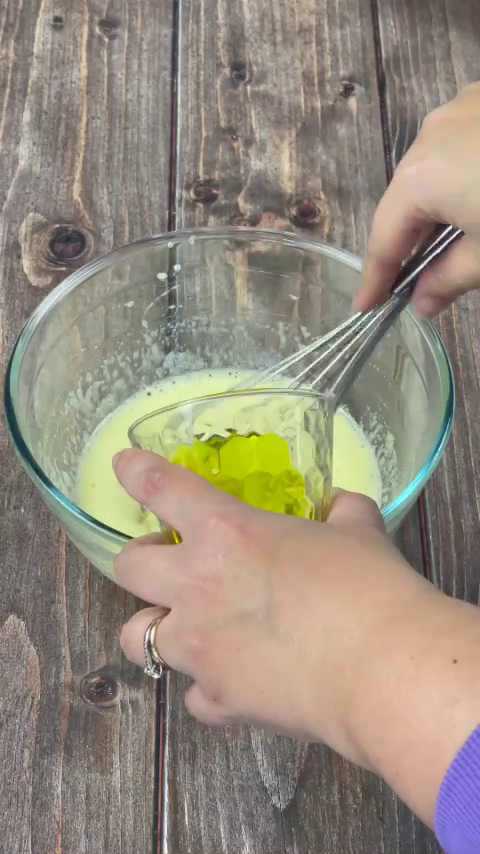 Continuando a mescolare, aggiungi a filo l’olio di oliva e continua fino a che non si sarà completamente inglobato nell’impasto.