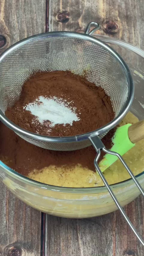 Setaccia nella ciotola il cacao amaro e il lievito in polvere per dolci. Mescola nuovamente con la spatola fino ad ottenere un composto omogeneo.