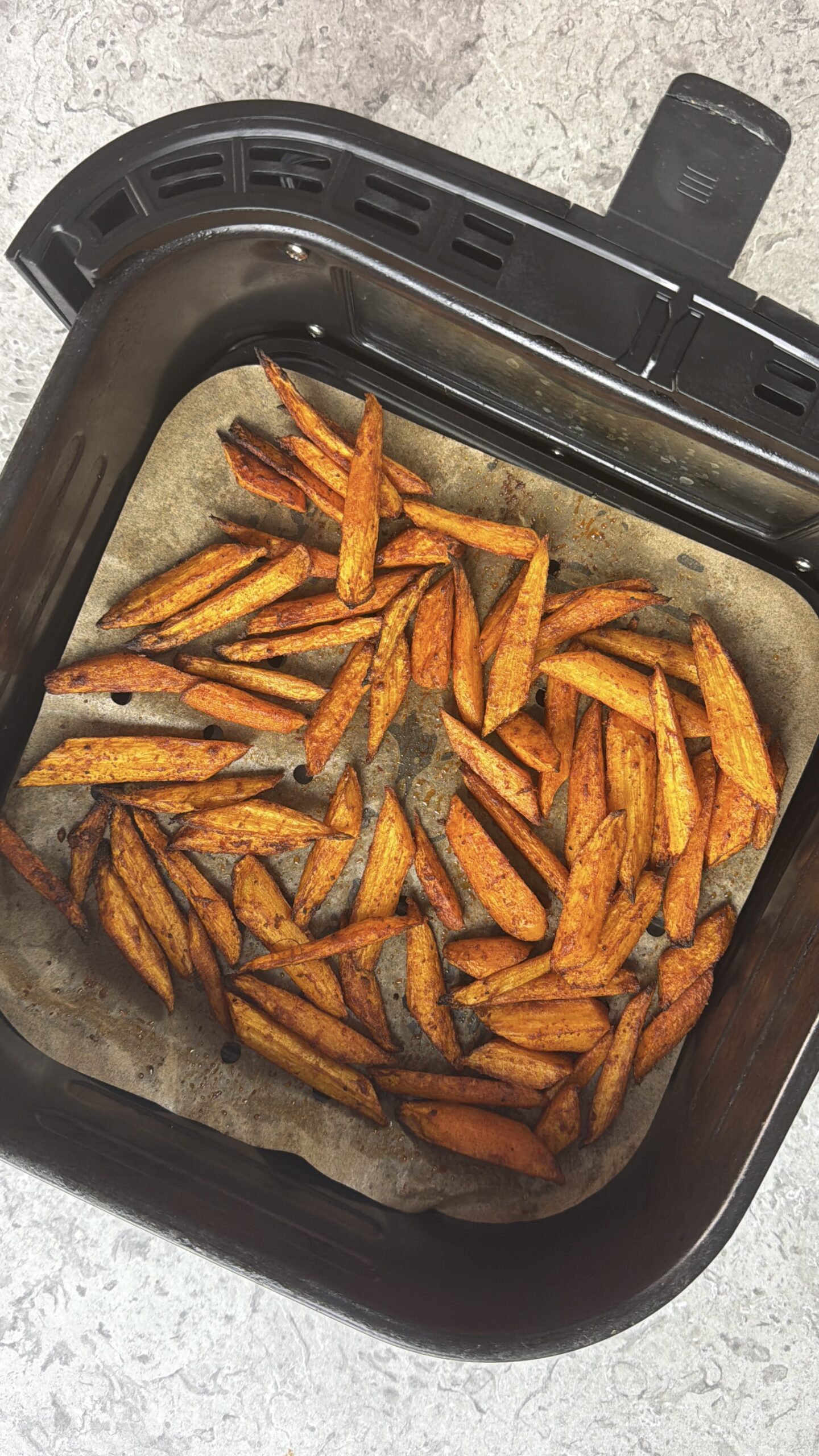Cuoci gli stick di carote speziati in friggitrice ad aria per 13 – 15 minuti girandoli a metà cottura.