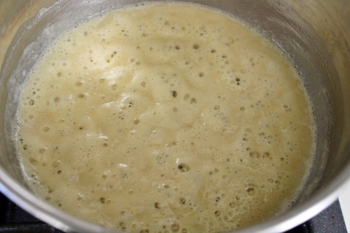 Nel frattempo, in un pentolino dal fondo spesso, fate sciogliere a fuoco basso il burro; quindi, aggiungete la farina in un colpo solo e mescolate energicamente con una frusta, fino a che incomincerà a fare le bollicine e diventerà di colore nocciola (il cosiddetto roux). Fate cuocere per circa 1 minuto.