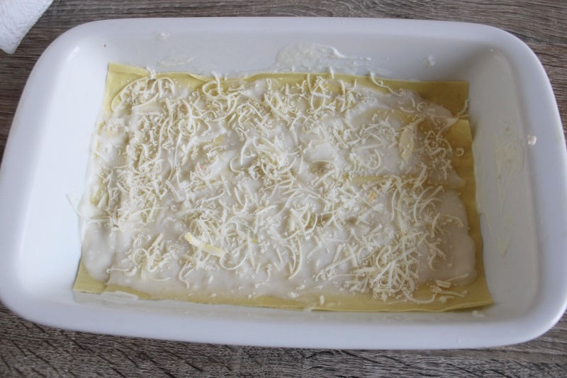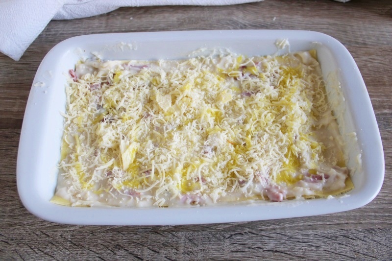 A questo punto, adagiate sopra la besciamella uno strato di lasagne, quindi di nuovo la besciamella, poi il condimento di speck e cipolla, una manciata abbondante di scamorza e parmigiano grattugiati.