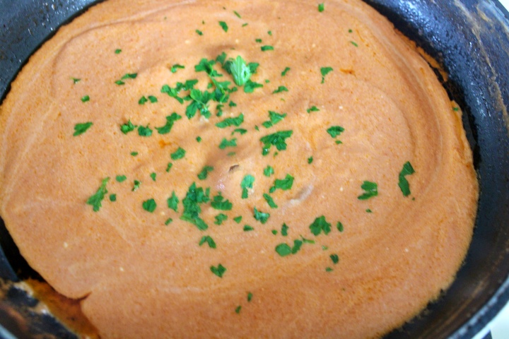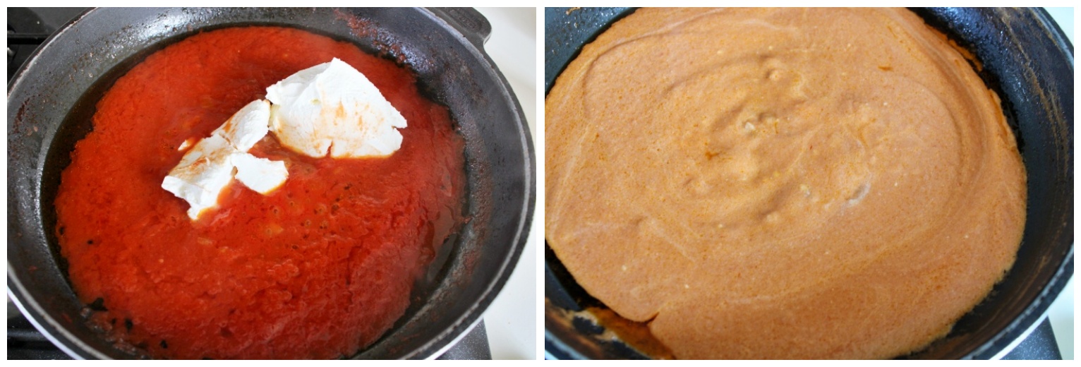 Intanto che la pasta cuoce, qualche minuto prima di colarla, aggiungete la philadelphia (o altro formaggio morbido spalmabile) al condimento caldo e amalgamate bene.