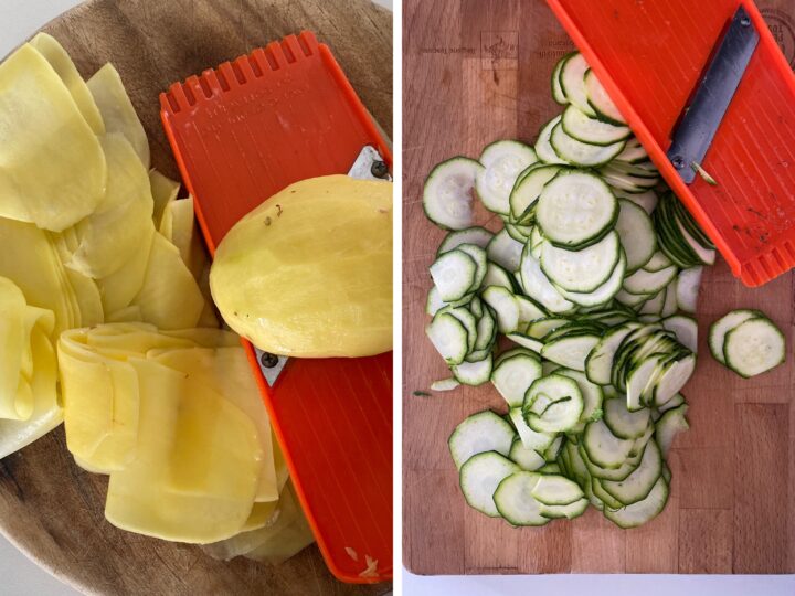 Per prima cosa, pelate le patate e sciacquatele bene, poi tagliatele molto sottilmente con l’ausilio di una mandolina oppure con l’apposita lama del robot da cucina.