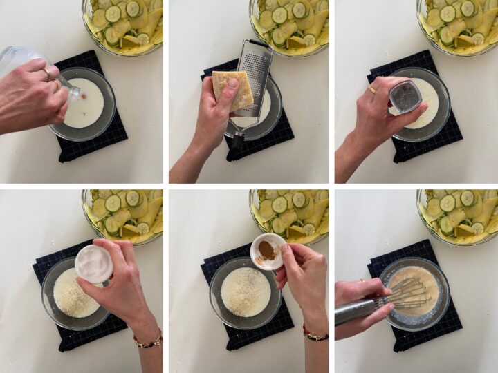 In una ciotola, sbattete le uova con il latte, poi aggiungete il formaggio grattugiato (parmigiano, grana, caciocavallo o pecorino) e condite con sale, pepe nero e noce moscata.