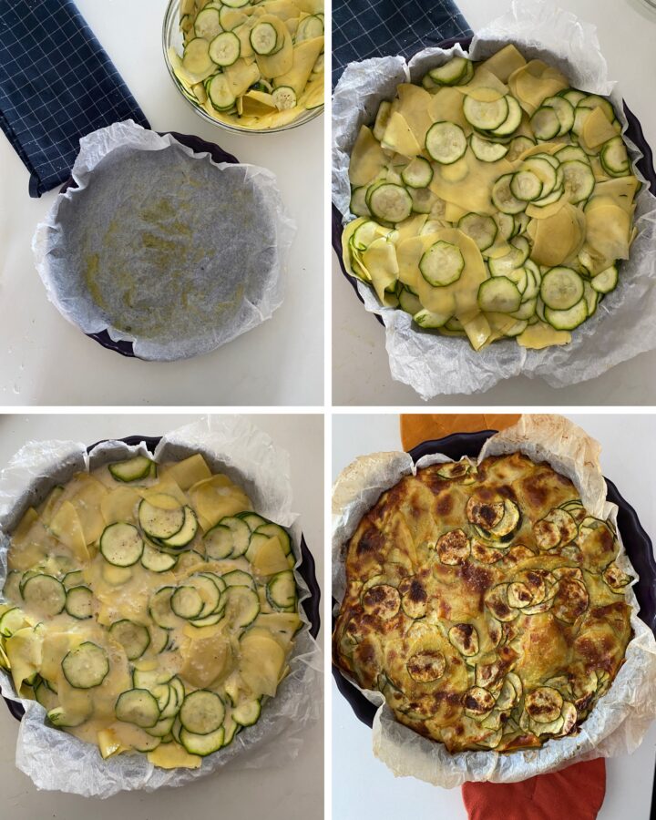 Questo tortino di patate e zucchine è naturalmente gluten free, perché non contiene farina, e non ha bisogno di precotture: tagliando molto sottilmente sia le zucchine che le patate, infatti, è possibile farle cuocere direttamente in teglia.