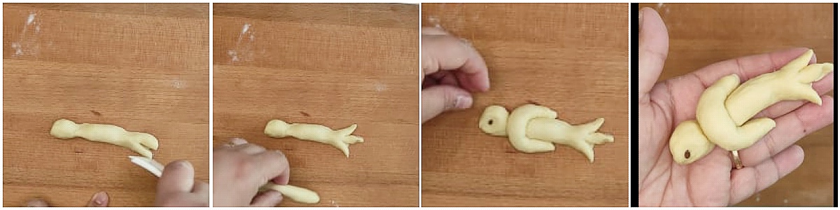 Per le colombine: Create dei cilindri con l’impasto da circa 6 cm. Assottigliate in due punti vicino le due estremità per evidenziare meglio la testa e la punta finale. Con un tarocco o un coltellino fate 3 taglietti sulla coda e appuntitele leggermente. Con le dita schiacciate anche leggermente la punta della testa per creare il becco. Con un cordoncino d’impasto più piccolo formate una U e posizioantelo sopra il corpo della colombina per creare le ali. Con un semino invece fate l’occhio.