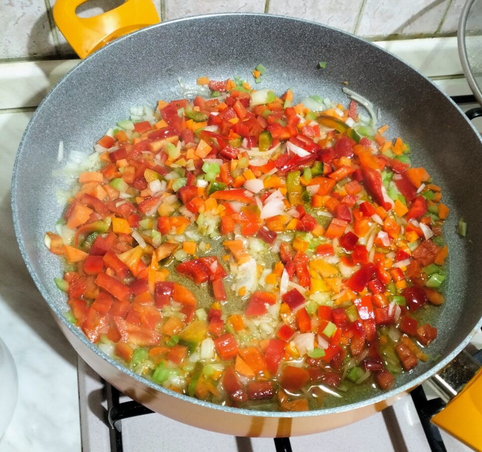 Aggiungere il peperone a dadini e lasciare cuocere per qualche minuto.