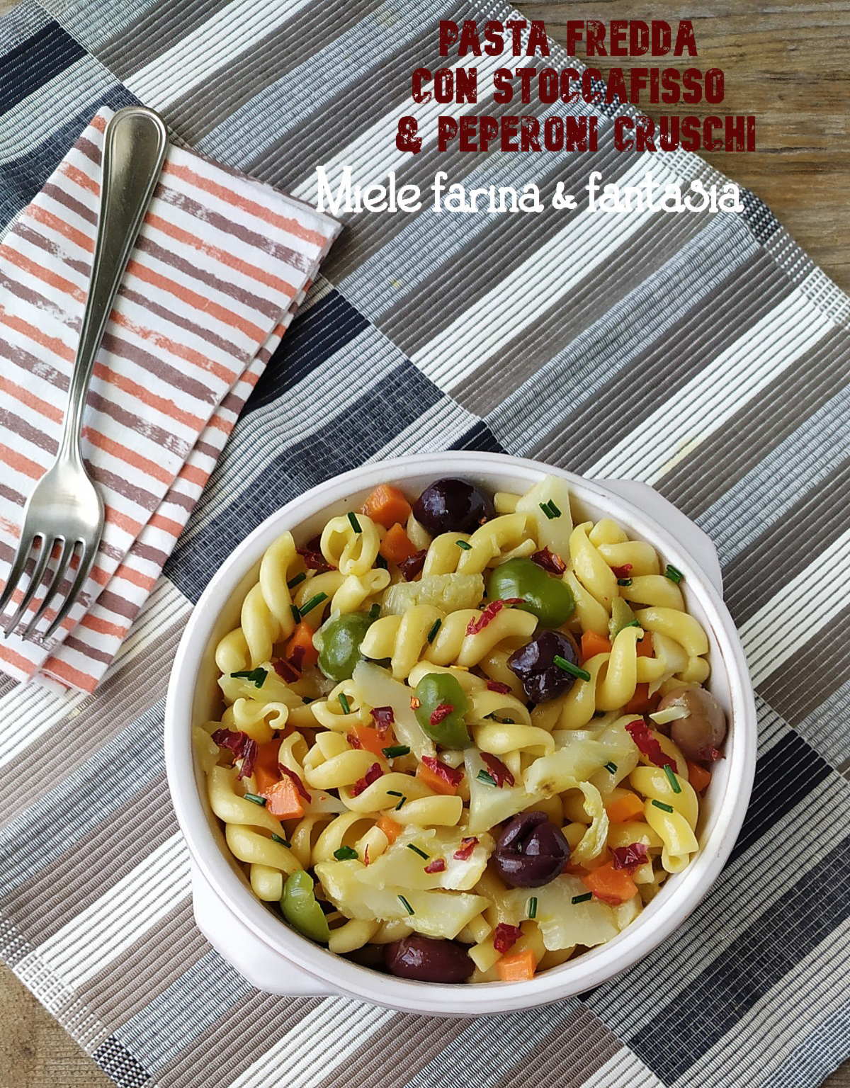 La pasta fredda con stoccafisso e peperoni cruschi è un primo completo, molto saporito, perfetto in questo periodo in cui le giornate iniziano a diventare calde. Si prepara con largo anticipo e si conserva in frigo. È una ricetta facilissima, perfetta anche come pranzo da schiscetta, da arricchire e personalizzare con ciò che abbiamo già a disposizione o secondo i nostri gusti ed esigenze.
