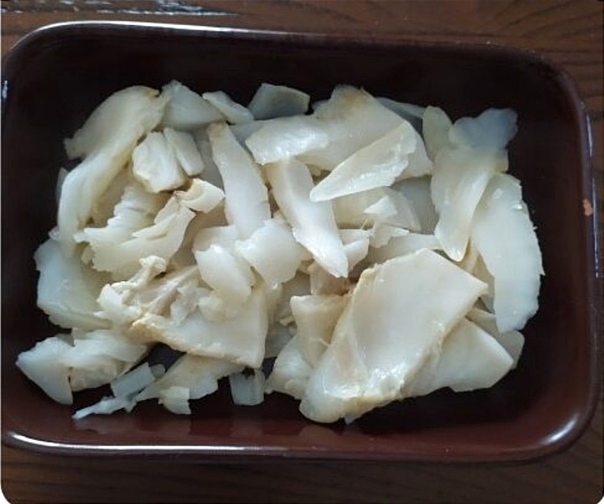 Trascorso il tempo, togliamo il pesce dall’acqua, in modo da capire se è cotto anche all’interno. La carne dello stoccafisso (così come iquella del baccalà sottoposta a stessa cottura, anche se con tempi più lunghi), quando è cotta bene, si apre, si separa come fosse composta da “petali”, come nella foto sottostante.