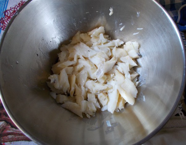 2) Scoliamo i pezzi di baccalà ed eliminiamo tutte le lische, la pelle, ecc…Trasferiamo il baccalà, ridotto in scaglie, nella ciotola di una planetaria.