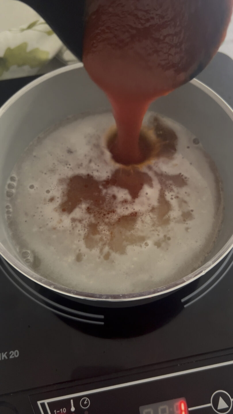 Quando l’acqua bolle versa il riso e quando il bollore riprende aggiungi 3 mestoli di sugo di pomodoro.