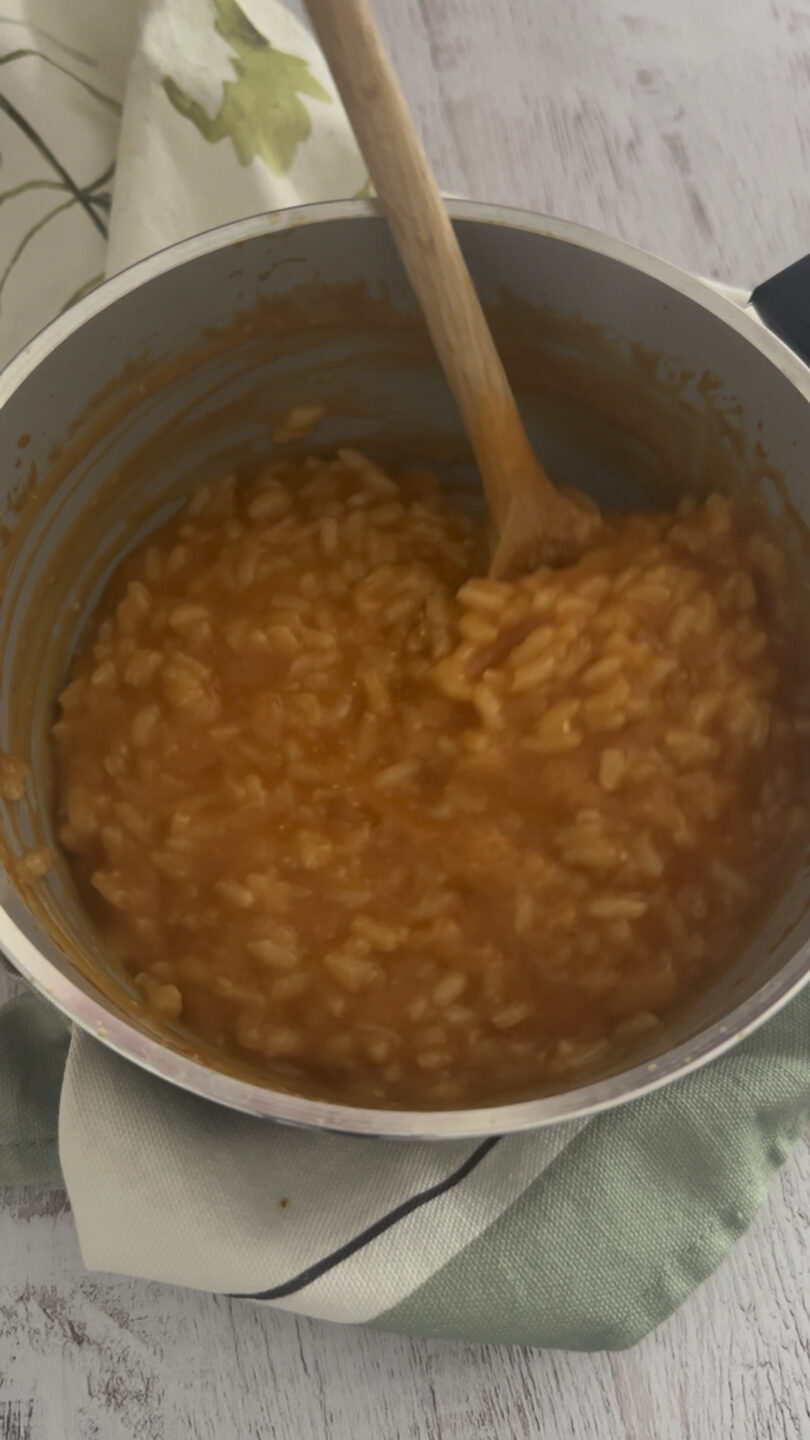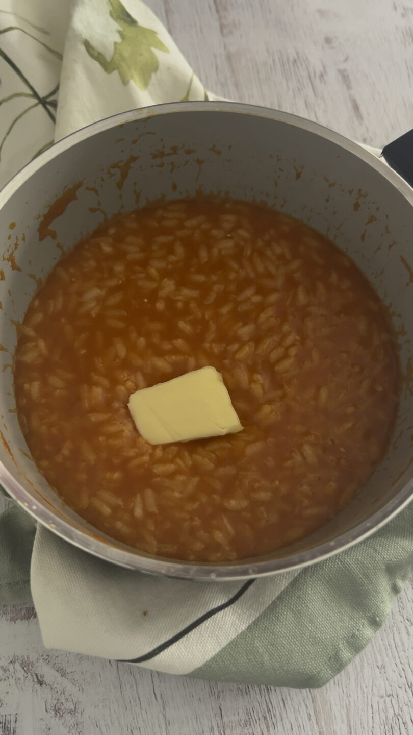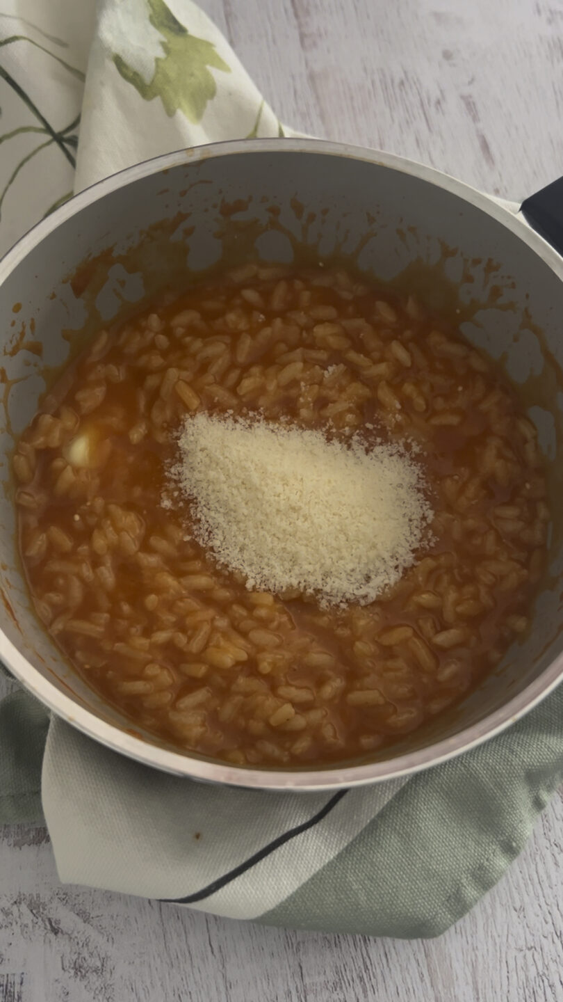 Quando il riso è cotto spegni il fuoco e manteca con burro e parmigiano.