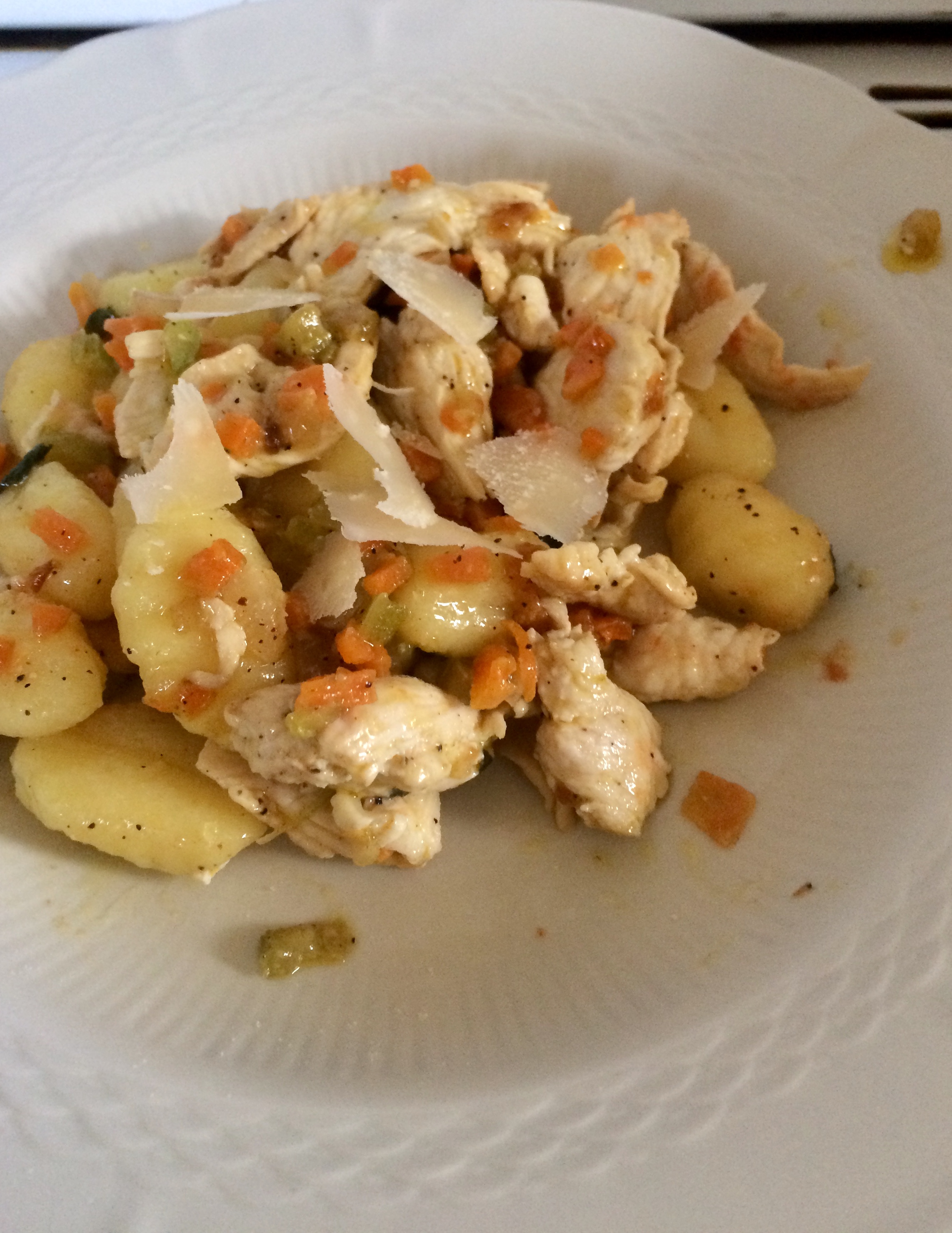 Lessiamo gli gnocchi in acqua salata finché verranno a galla. Scoliamoli e versiamoli nel tegame col ragù di pollo. Saltiamo e impiattiamo guarnendo con scagliette di parmigiano. Buon appetito. https://blog.giallozafferano.it/minnie/