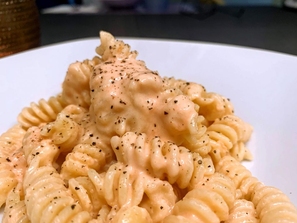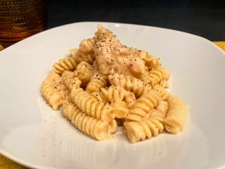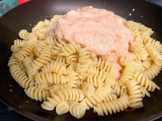 Trasferire la pasta al dente nella padella e versare il composto di salmone. Mantecare a fuoco spento e se risulta troppo asciutta, aggiungere un po’ di acqua della pasta fino a raggiungere la cremosità desiderata.