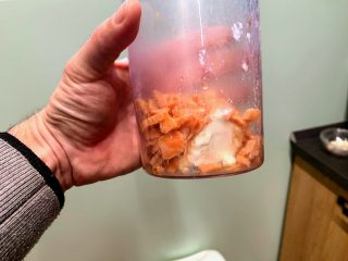 (facoltativo) Se volete una crema omogenea, trasferite il salmone in un contenitore dai bordi alti, un cucchiaio di olio e un mestolo di acqua della pasta. Tritare con il frullatore a immersione.