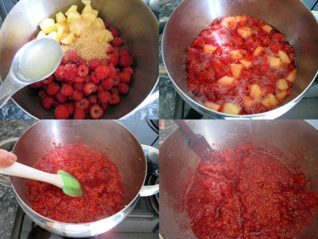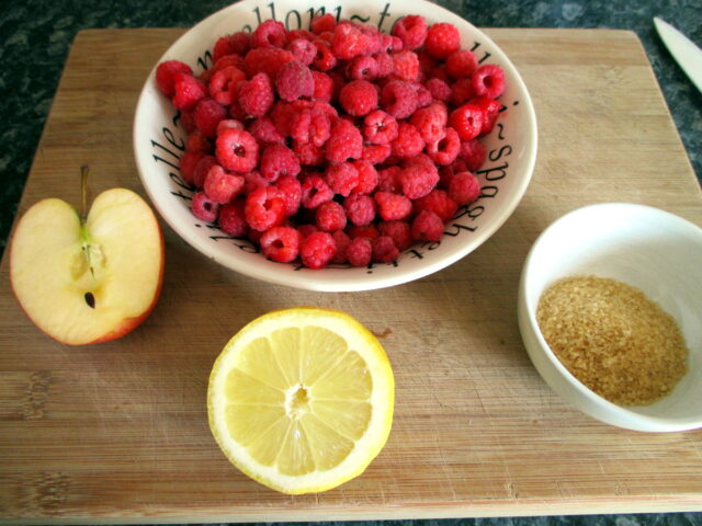 Inizia preparando tutti gli ingredienti. Lava benissimo i lamponi, sbuccia la mela e tagliala a pezzettini, spremi il limone e pesa lo zucchero.