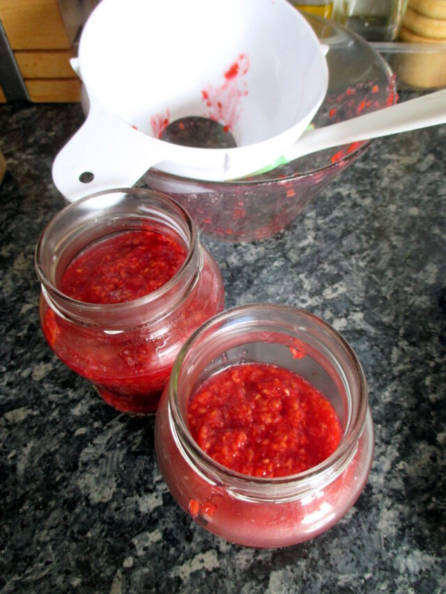 Non far asciugare troppo la composta di lamponi perchè poi raffreddandosi si addenserà ulteriormente. Io ho ottenuto 330 grammi di composta in totale.
