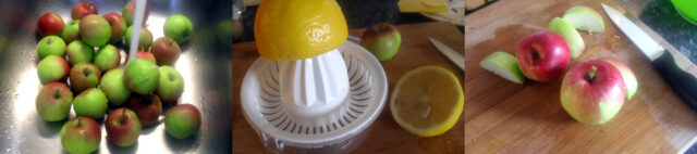 Mettere le mele, man mano che si tagliano, in una ciotola capiente assieme al succo di uno dei limoni e girare spesso per evitare che scuriscano.
