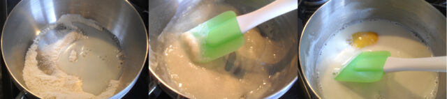 Mescola in un pentolino farina, zucchero, vanillina e un quarto del latte in modo da formare una cremina.