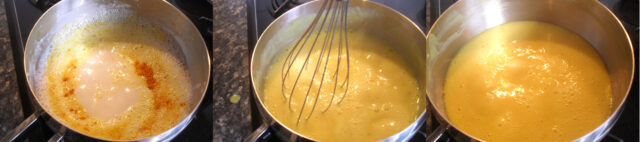 Appena inizia a bollire aggiungi la curcuma sempre mescolando con la frusta e qualora si dovessero formare dei grumi puoi usare il frullatore ad immersione per qualche secondo. In tal caso alza la buccia di limone e poi la rimetti dentro.