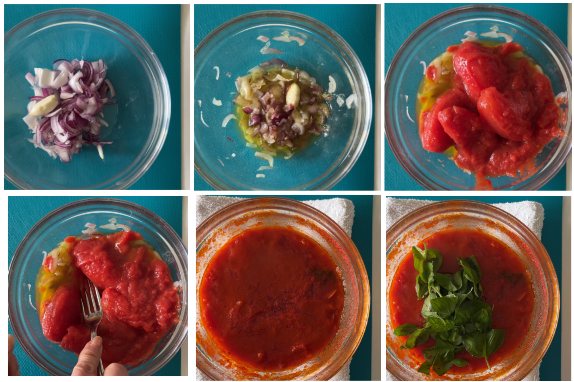 Aggiungete i pomodori pelati alla cipolla rosolata e schiacciateli con la forchetta, mescolate e inserite la ciotola nel microonde.
