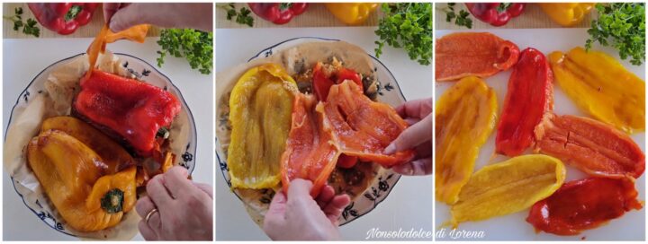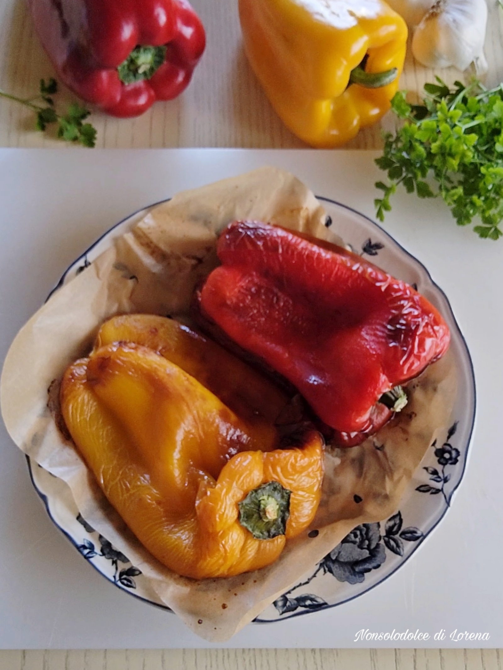 La cosa importante è girare i peperoni durante la cottura, 2-3 volte, per rendere la rosolatura uniforme.