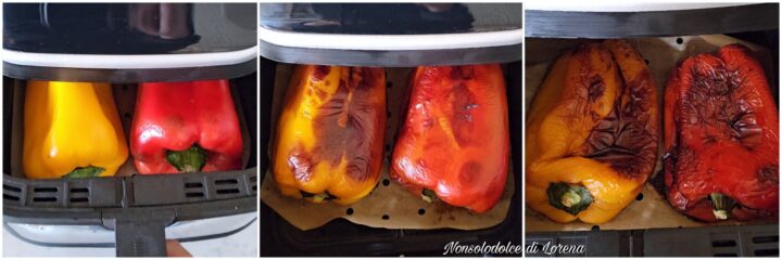 Come arrostire i peperoni in friggitrice ad aria, ecco a voi un modo molto veloce e facilissimo per arrostire e spellare i peperoni senza alcuna difficoltà. Con questo metodo semplicissimo non vi servira nemmeno metterli nel classico sacchetto del pane una volta arrostiti, ma basterà tenerli chiusi dentro il cestello della friggitrice ancora qualche minuto una volta spenta e la pellicina verrà via praticamente da sola. Tra l’altro si risparmia molto tempo in confronto a farli nel forno tradizionale: (20-25 minuti contro i 40-45 minuti del forno + preriscaldamento e passaggio nel sacchetto)