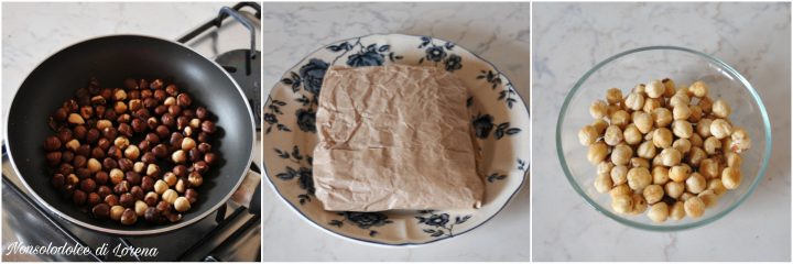 Per tostare e tritare le nocciole io faccio in questo modo: metto le nocciole in una padellina antiaderente senza aggiungere nulla e le faccio tostare a fuoco medio-basso scuotendo la padella di tanto in tanto (per una decina di minuti). Dopodiché le chiudo dentro un sacchetto del pane e le lascio raffreddare, in questo modo la pellicina viene via facilmente, basta strofinarle leggermente tra le mani. Infine le trito abbastanza finemente con il tritatutto elettrico.