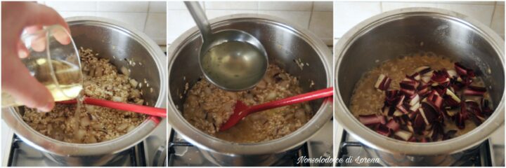 Sciacquate le foglie del radicchio rosso trevigiano , tagliatele a tocchetti e unite al soffitto, intanto la parte bianca, lasciando da parte la parte rossa delle punte. Mescolate, e cuocete per 2 minuti circa, aggiungendo all’occorrenza un goccio di brodo caldo.