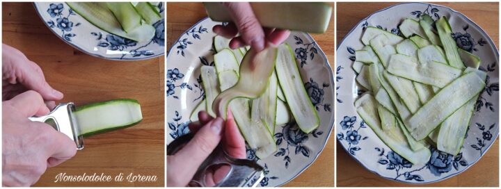 Per le Rose di sfoglia zucchine e prosciutto sciacquate le zucchine, eliminate le estremità e tagliatele a fettine sottilissime (io ho fatto con il pelapatate), oppure potete utilizzare una mandolina.
