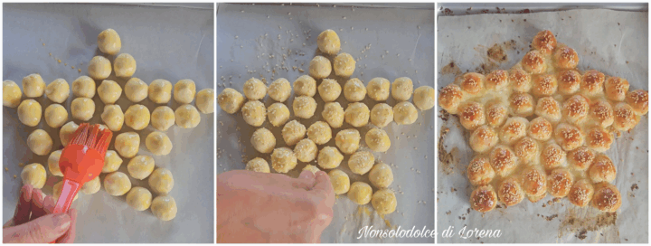 Posizionate le palline nella teglia rivestita con carta forno come vedete in foto. Adagiate prima le 28 palline esterne per formare la stella, e poi aggiungete le restanti 8 all’interno della stella.