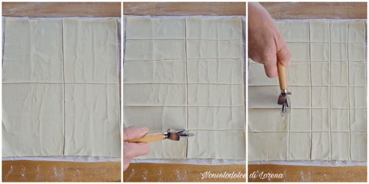Inizialmente ho fatto una croce ricavando quattro quadrati, poi ho fatto altri quattro tagli lunghi da una parte all’altra della pasta sfoglia ottenendo in tutto 36 quadratini (come vedete in foto).