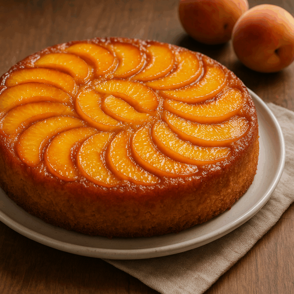Soffice base profumata al limone, ricoperta da succose pesche caramellate, disposte a raggiera.