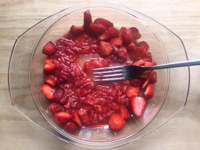 Lavare le fragole, tagliarle a pezzetti e schiacciarle con una forchetta.