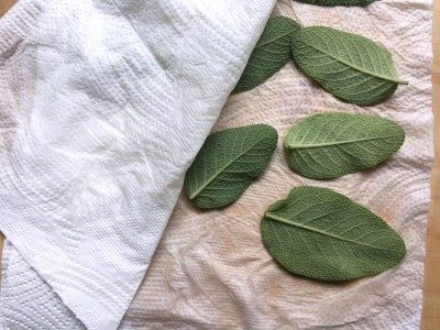 Lavare le foglie di salvia, poi asciugarle bene tamponandole con carta da cucina.