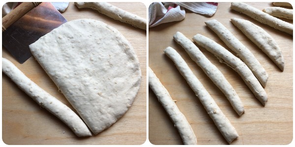 Trascorso il tempo di questa prima lievitazione, riportare l’impasto sulla spianatoia, appiattirlo con le mani e ricavare dei filoncini come mostrato nella fotografia.