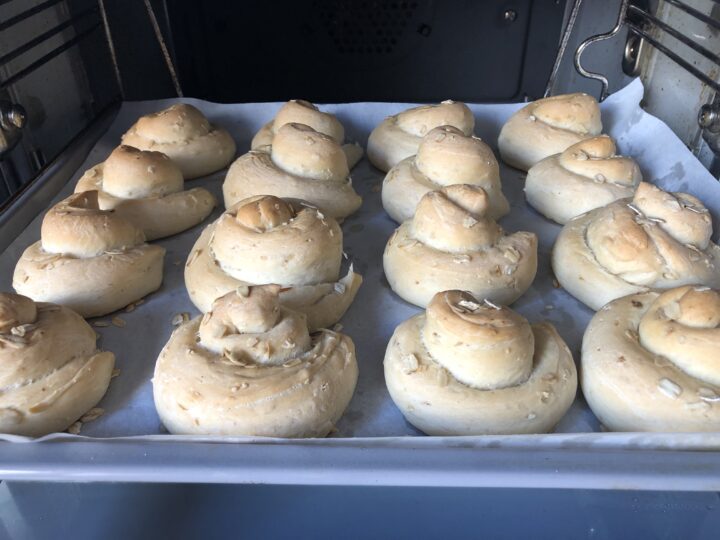 Morbide e con una piacevole nota rustica, queste focaccine ai fiocchi di avena sono perfette per arricchire la tavola con qualcosa di semplice ma curato. L’impasto, a base di farina 0 e manitoba, è reso soffice dal burro e bilanciato dalla presenza dell’avena che dona struttura e carattere. Io le ho fatte a forma di chiocciola ma naturalmente le potete realizzare anche in altre forme o semplicemente come delle palline appiattite. Si prestano ad essere tagliate e farcite oppure utilizzatele al posto del pane. Accendete il forno e provatele: sarà difficile aspettare che si raffreddino. Scommettiamo?
