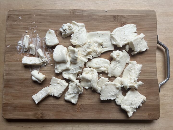 Tagliare il taleggio a pezzetti. Per sperare di tagliarlo più facilmente io l’ho messo in freezer per circa 30 minuti: in questo modo si compatta un po’ e risulta meno morbido sotto il coltello ma non aspettatevi fette perfette e precise. Il taleggio resta un formaggio cremoso un po’ ribelle. Tuttavia l’obiettivo non è la perfezione e andranno benissimo anche pezzi irregolari che in cottura si scioglieranno senza problemi.