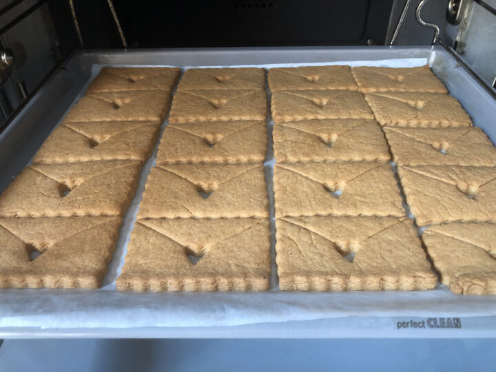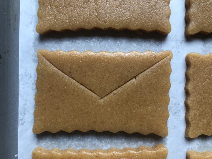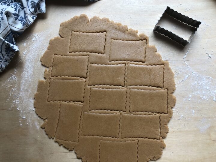 Stenderla con il mattarello ad uno spessore di circa 4 mm e tagliare e biscotti con uno stampino rettangolare.