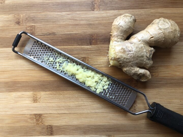 Sbucciare la radice di zenzero e grattugiarlo.
