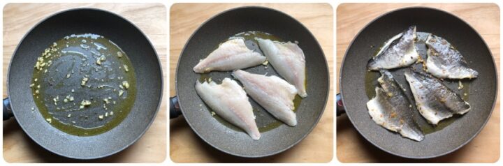 Lasciar sfrigolare per qualche istante poi disporre nella padella i filetti di orata e cuocerli a fiamma medio-bassa un paio di minuti per lato, girandoli delicatamente con una paletta.