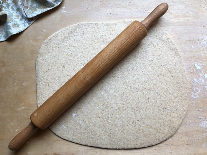Trascorso il tempo di questa prima lievitazione, trasferire di nuovo l’impasto sulla spianatoia leggermente infarinata e stenderlo con il mattarello ad uno spessore di circa 4 millimetri.