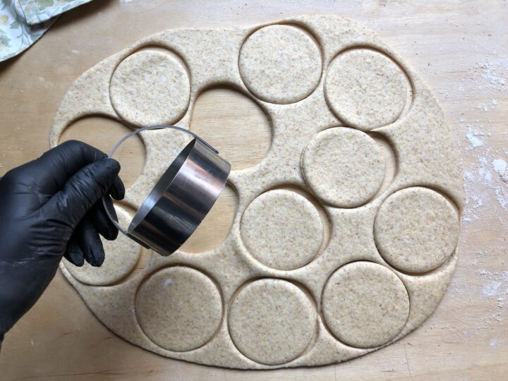 Quindi, ricavare dei cerchi con un coppapasta o un taglia tigelle del diametro di 8 cm. Se non avete questi attrezzi, potete tranquillamente utilizzare un bicchiere. Impastate nuovamente i ritagli e procedete allo stesso modo fino ad esaurimento di tutto l’impasto.